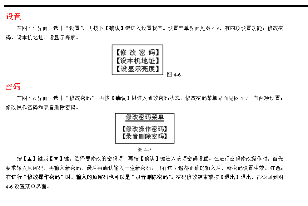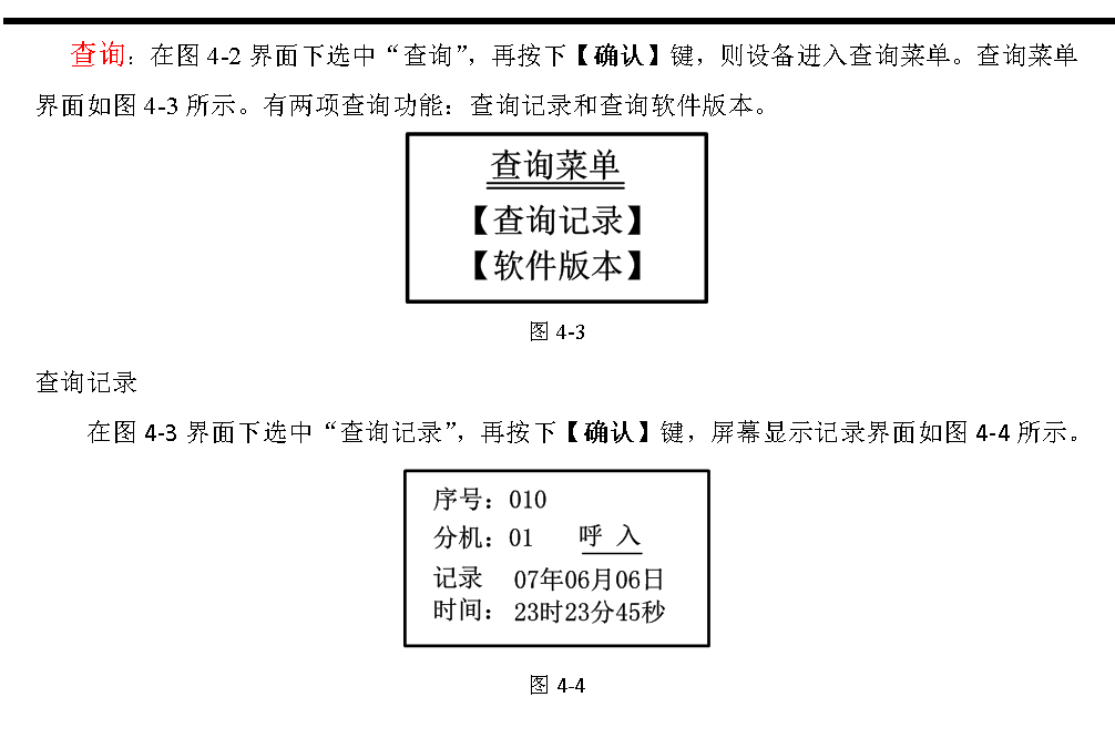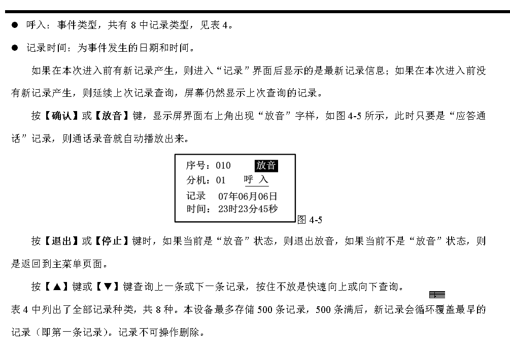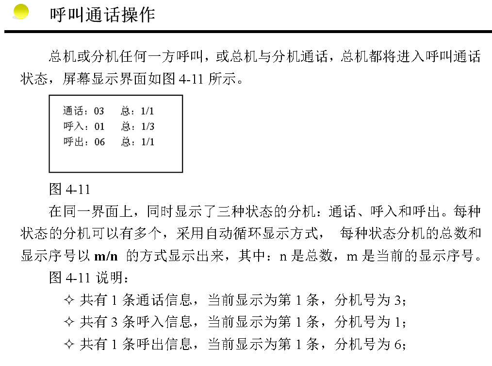 在圖3-16所示的呼叫通話顯示界面上,每種狀態(tài)的分機可能不止1個,本設(shè)備采用自動循環(huán)顯示方式,自動循環(huán)顯示大約是每1.5秒顯示一個。在自動循環(huán)顯示的同時也可手動插入查詢循環(huán)顯示的分機號。按【▲】鍵或【▼】鍵分別是向前或向后逐個查詢,每按一下向前或向后顯示一個,如果停止操作10秒鐘,那么又重新回到自動循環(huán)顯示方式。