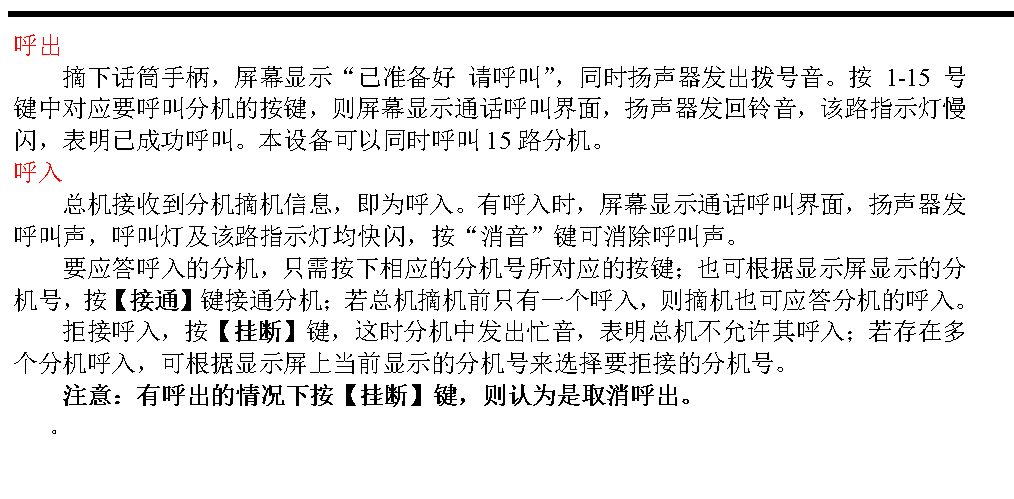 ² 自動掛機:在呼出、呼入或通話結(jié)束后,此時無任何呼出、呼入及通話,則總機發(fā)出忙音,同時顯示屏顯示“通話結(jié)束,請掛機”,要求操作者將話筒掛到掛鉤上。