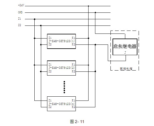 采用消火栓按鈕直接起泵方式應用接線示意圖如圖2-11: