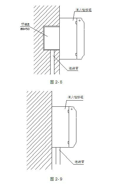 消 火栓按鈕采用明裝方式,分為進線管明裝和進線管暗裝:進線管暗裝時只需拔下按鈕,從底殼的進線孔中穿入電纜并接在相應端子上,再插好按鈕即可安裝好,安裝 示意圖見圖2-8;進線管明裝時只需拔下按鈕,將底殼下端的敲落孔敲開,從敲落孔中穿入電纜并接在相應端子上,再插好按鈕即可安裝好,安裝示意圖見圖 2-9;安裝孔距為60mm。
