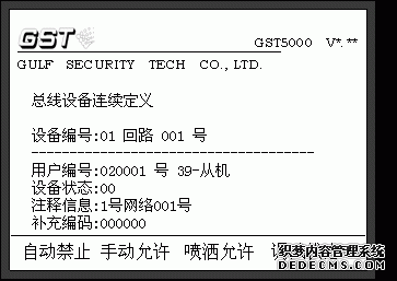 GST聯(lián)網(wǎng)時,聯(lián)網(wǎng)控制器必須定義網(wǎng)絡(luò)中所有的控制器。定義方式同總線設(shè)備定義,如圖8-7。進(jìn)入設(shè)備定義界面,按照圖8-7所示在回路號編輯框中輸入控 制器的聯(lián)網(wǎng)板號,設(shè)備號為要定義的控制器聯(lián)網(wǎng)地址(范圍001-032),如001號是指該條網(wǎng)絡(luò)中的1號從機,002號指的是該條網(wǎng)絡(luò)中的2號從 機,003號指的是3號從機……。用戶編碼是指各個從機的控制器二次碼,設(shè)備類型為39-從機。