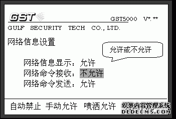 - 網(wǎng)絡(luò)命令接收-不允許:控制器不接收、不執(zhí)行網(wǎng)絡(luò)上傳來的啟動、停動、屏蔽、取消屏蔽、自檢等網(wǎng)絡(luò)命令;